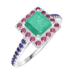 Inel Aur alb 18 carate - Smarald Princess 0.5 carate - Halo Rubin - Încrustare Safir albastru