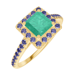 Inel Aur galben 18 carate - Smarald Princess 0.5 carate - Halo Safir albastru - Încrustare Safir albastru