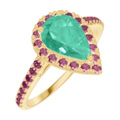 Inel Aur galben 18 carate - Smarald Pară 0.5 carate - Halo Rubin - Încrustare Rubin