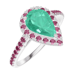 Inel Aur alb 18 carate - Smarald Pară 0.5 carate - Halo Rubin - Încrustare Rubin