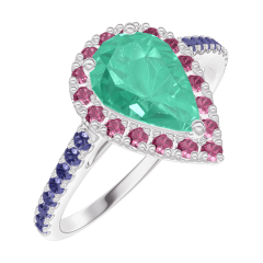 Inel Aur alb 18 carate - Smarald Pară 0.5 carate - Halo Rubin - Încrustare Safir albastru