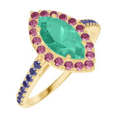 Inel Aur galben 9 carate - Smarald Marquise 0.5 carate - Halo Rubin - Încrustare Safir albastru