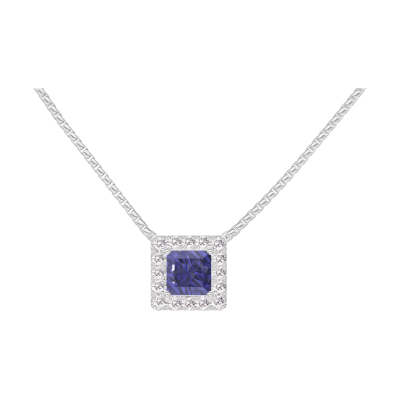 « L'ATELIER » Nº202064Colier Aur alb 9 carate - Safir albastru Princess 0.3 carate - Halo Diamant - Lanţ Veneţian