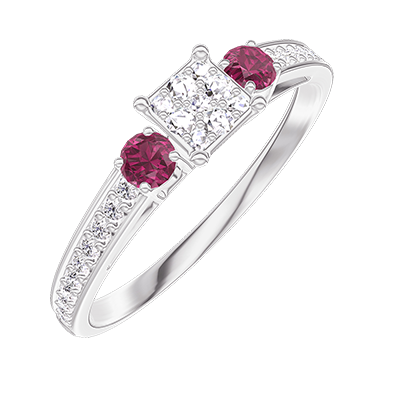 « L'ATELIER » NR. 209147Inel Aur alb 18 carate - Cluster de diamante naturale Princess echivalent 0.3 - Pietre laterale Rubin - Încrustare Diamant