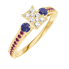 « L'ATELIER » NR. 209269Inel Aur galben 18 carate - Cluster de diamante naturale Smarald echivalent 0.3 - Pietre laterale Safir albastru - Încrustare Rubin