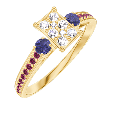 « L'ATELIER » NR. 209870Inel Aur galben 9 carate - Cluster de diamante naturale Smarald echivalent 0.5 - Pietre laterale Safir albastru - Încrustare Rubin
