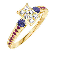« L'ATELIER » NR. 209870Inel Aur galben 9 carate - Cluster de diamante naturale Smarald echivalent 0.5 - Pietre laterale Safir albastru - Încrustare Rubin