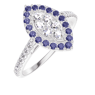« L'ATELIER » NR. 211680Inel Aur alb 9 carate - Cluster de diamante naturale Marquise echivalent 0.5 - Halo Safir albastru - Încrustare Diamant