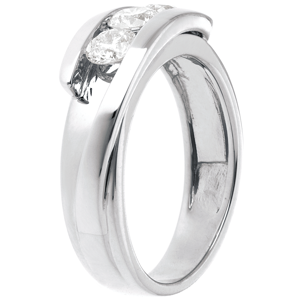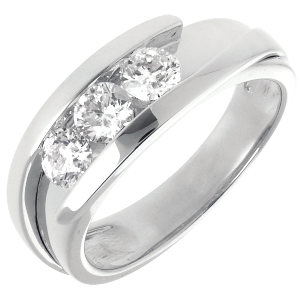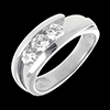 O montură sobră şi clasică subliniată de un inel dublu uşor întredeschis asupra unei trilogii de diamante.