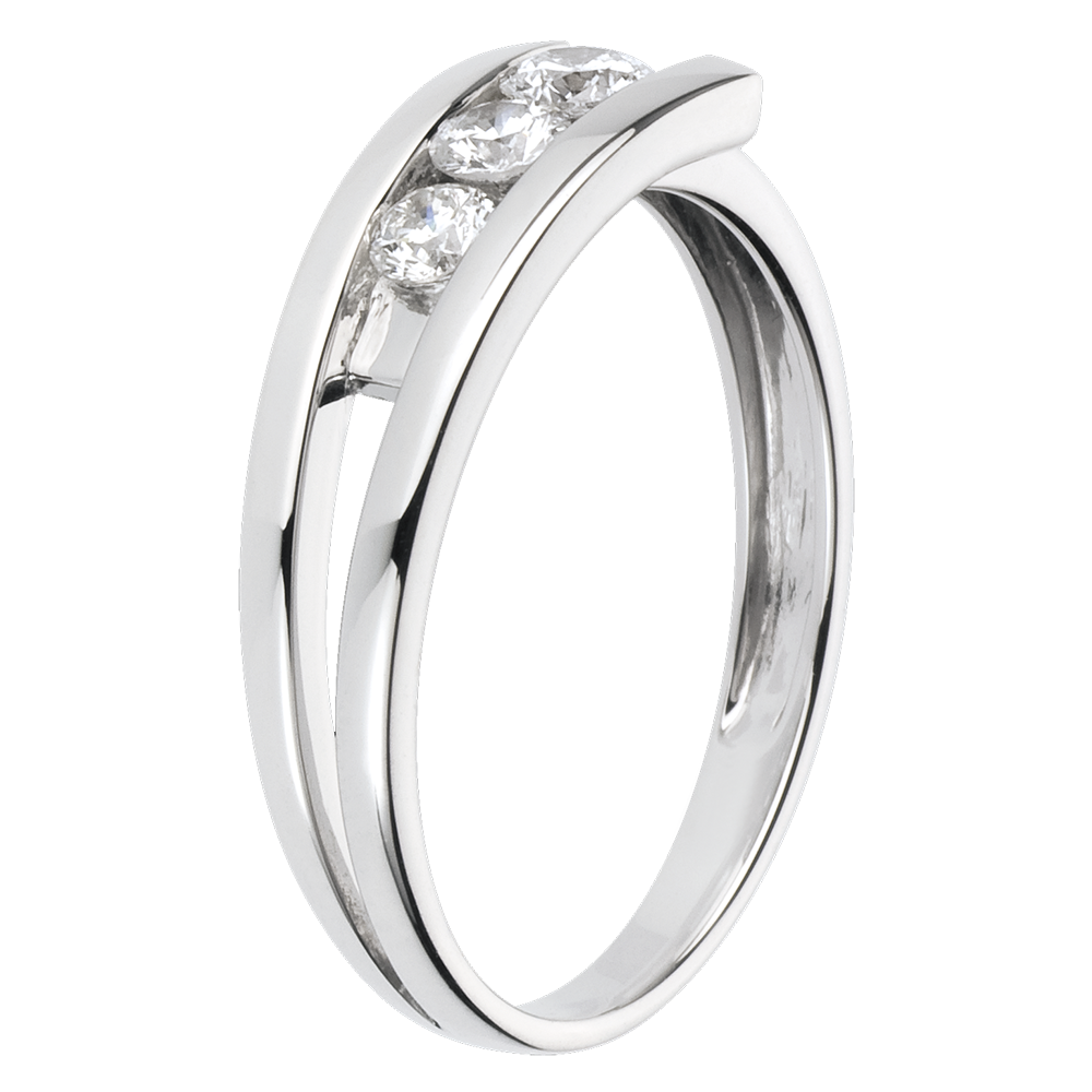 Trei barete de aur alb sub formă de inel pentru a încorona simplu şi evident o trilogie de diamante.