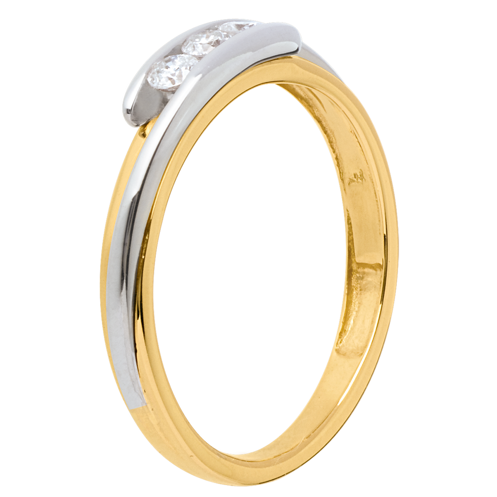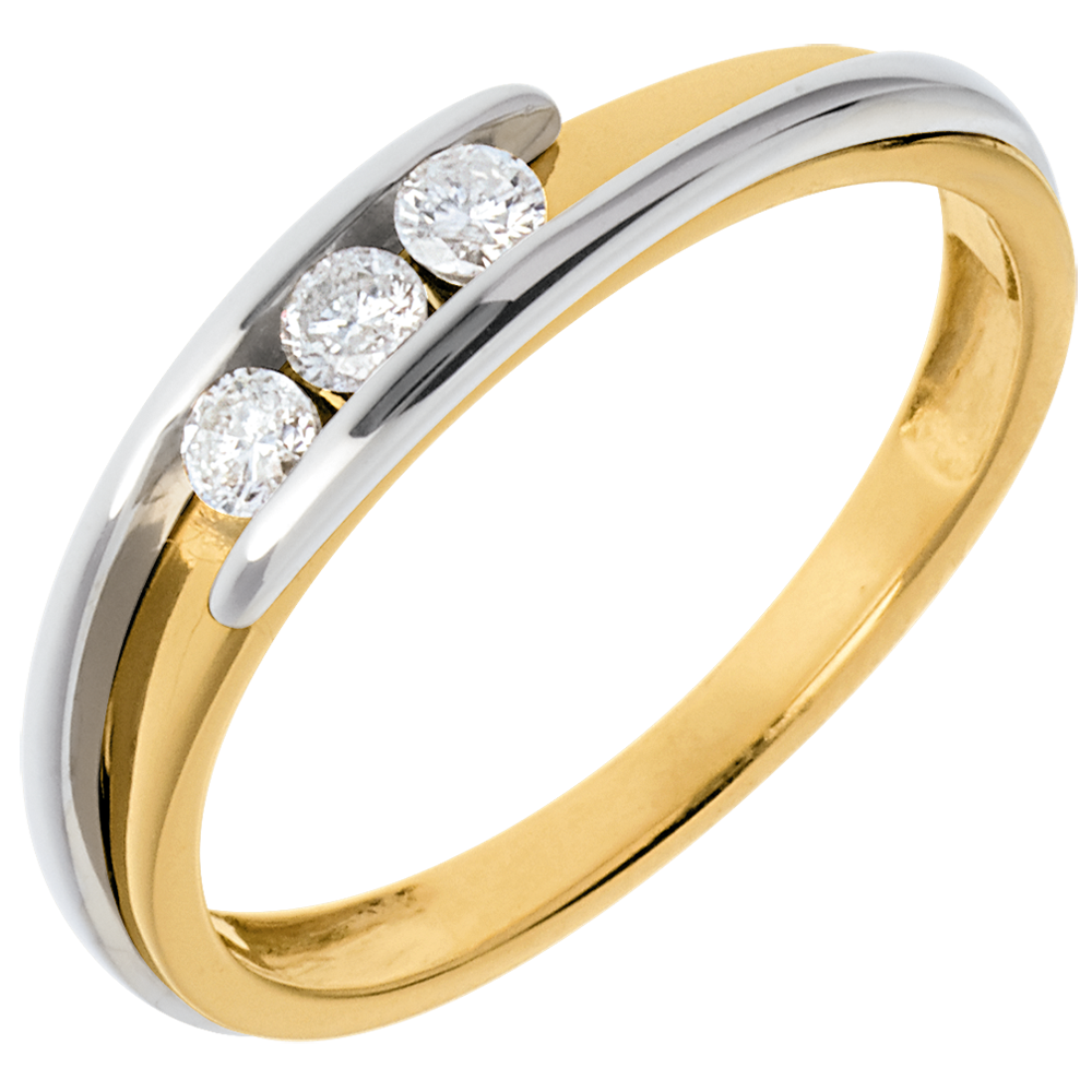 O montură sobră şi clasică asociată forţei îmbinării celor două nuanţe de aur: galben şi alb, pentru a sublinia cu delicateţe trilogia de diamante.