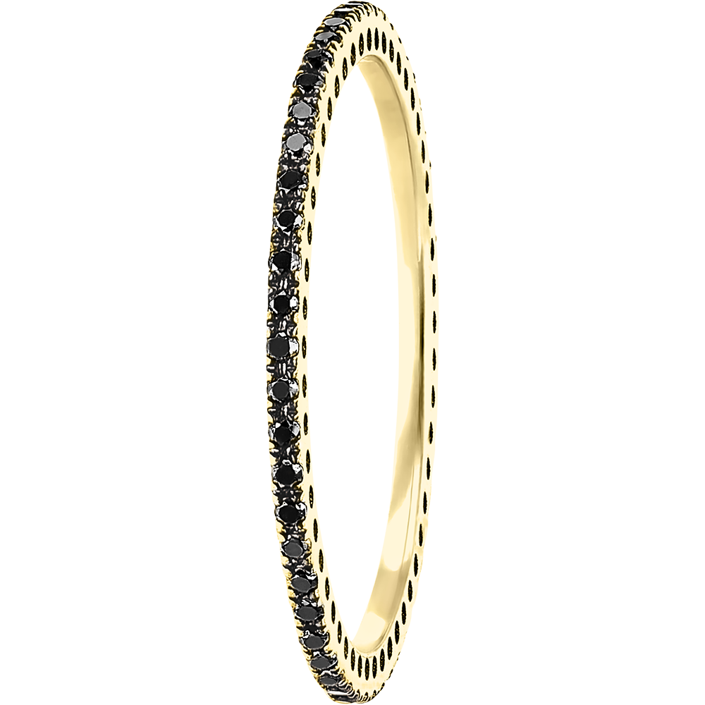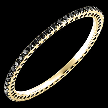 Un inel subțire și delicat din aur galben, încrustat cu diamante negre - tur complet. Această verighetă este ideală pentru a însoți un inel de logodnă sau pentru a fi purtată singură.