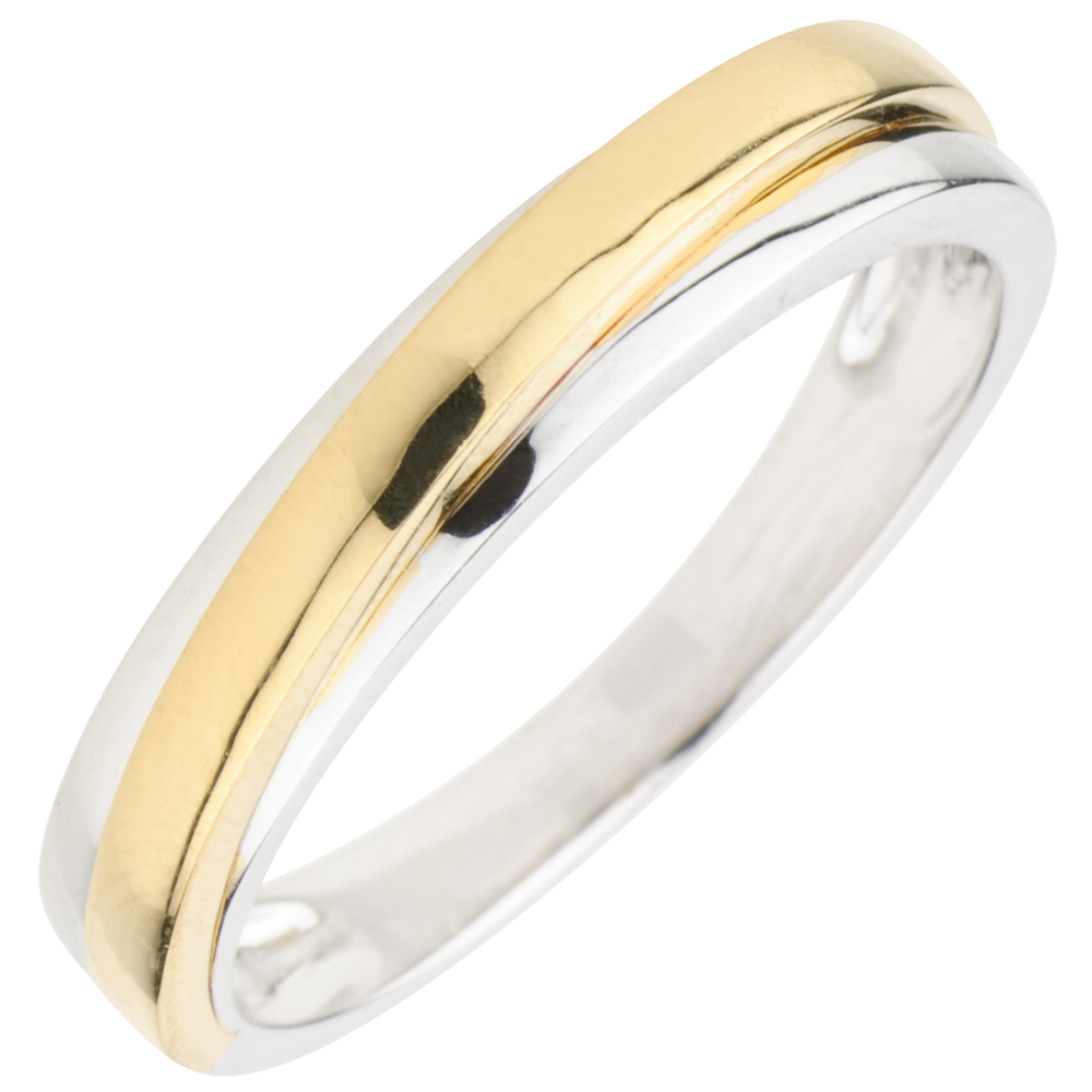 Un inel de aur alb traversat de o bandă strălucitoare şi bombată de aur pentru un efect elegant de inel dublu.