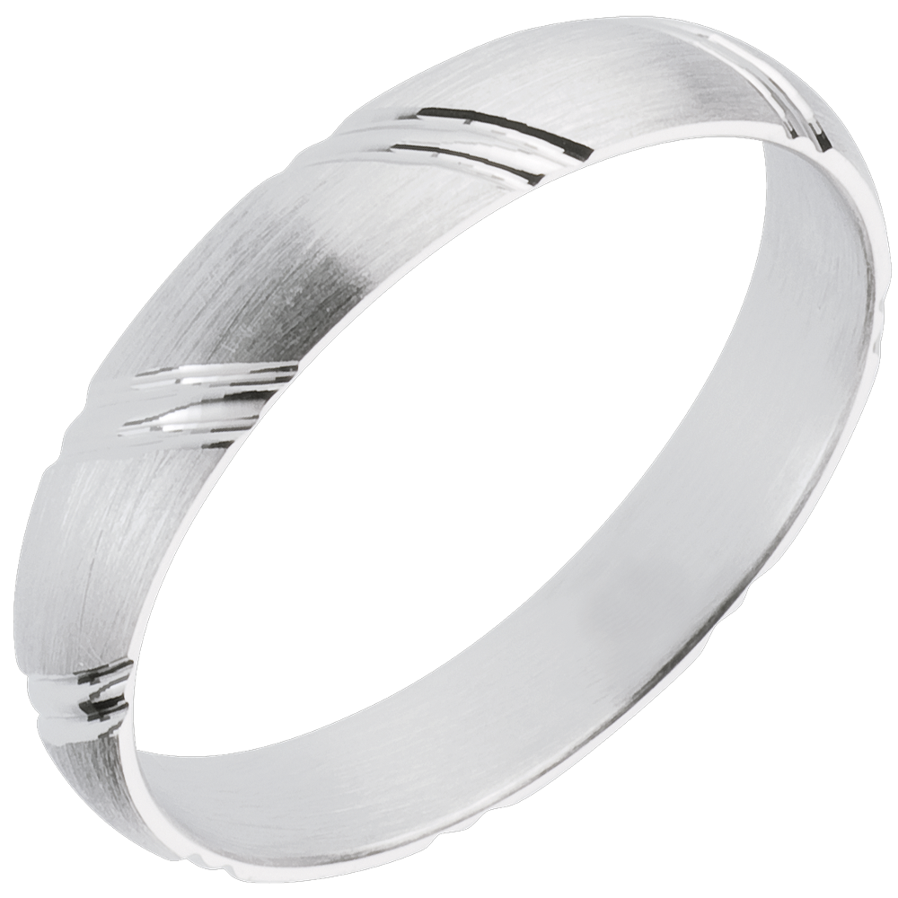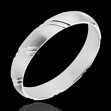 Un motiv lejer şi grafic pentru a sublinia eleganţa clasică a unui inel din aur alb.