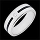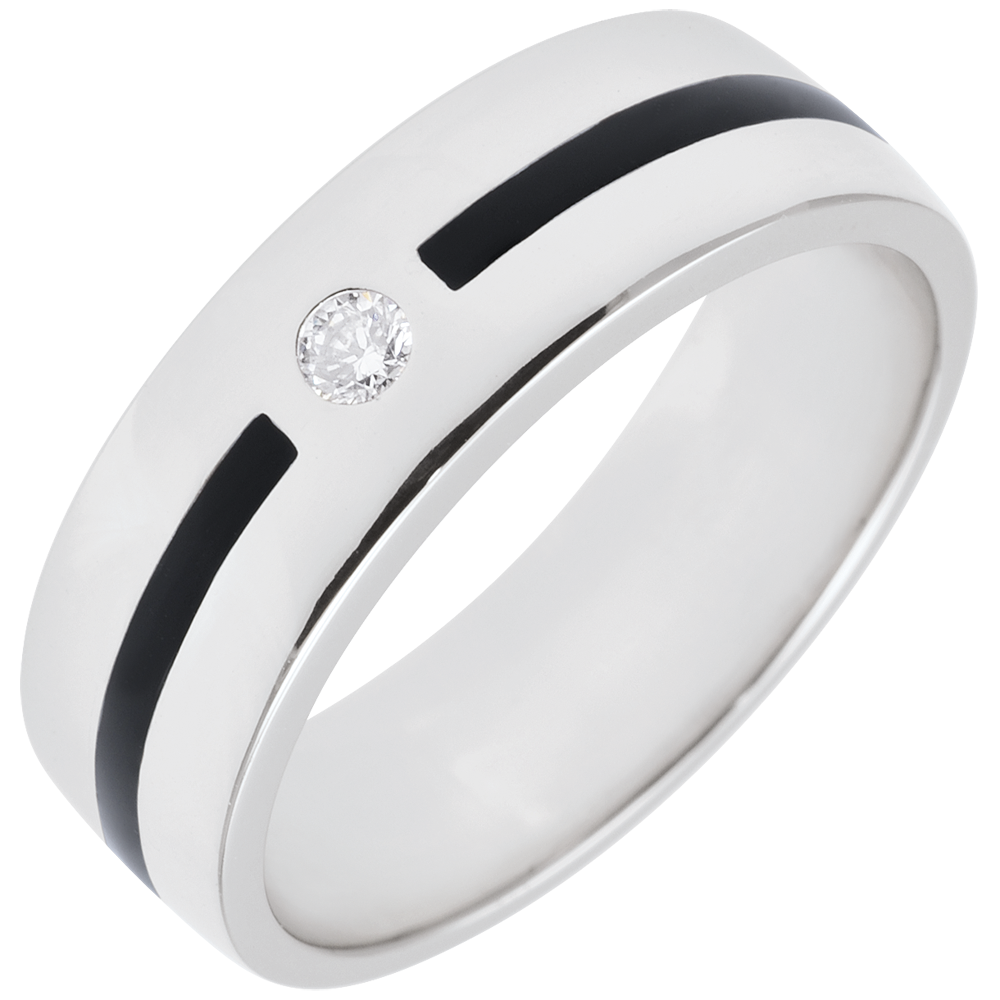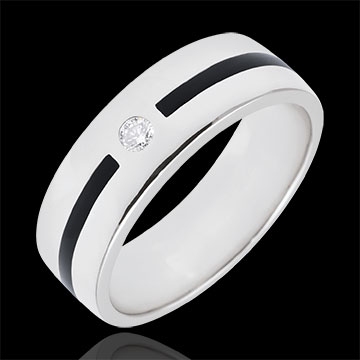 O Verighetă lată Clar Obscur din aur alb este împodobită cu un diamant central şi traversată de o bandă de lac de un negru profund.
