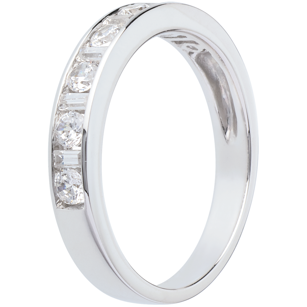 Echilibrul perfect al unui inel cu diamante tăiate briliant şi baghetă, setate bară, pentru o simbolică puternică. O bijuterie esenţială pentru o legătură de excepţie.