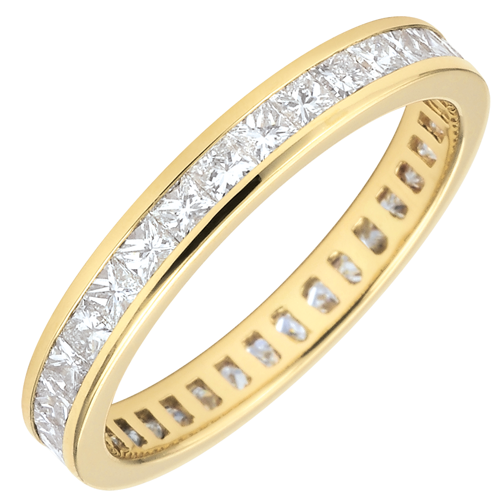 Echilibrul perfect al unui inel din aur galben pavat cu diamante princess setate bară, pentru o simbolică puternică. O bijuterie esenţială pentru o legătură de excepţie.