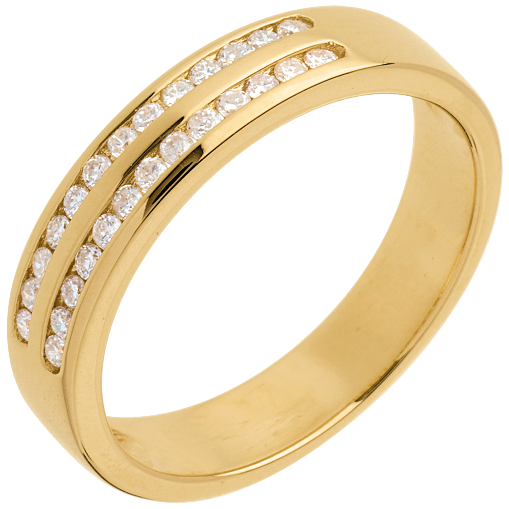 Echilibrul perfect al unui inel cu două rânduri de diamante setate bară, pentru o simbolică puternică. O bijuterie esenţială pentru o legătură de excepţie.