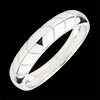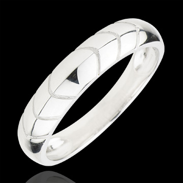 O verighetă bombată din aur alb cu un decor modern, puternic şi îndrăzneţ.