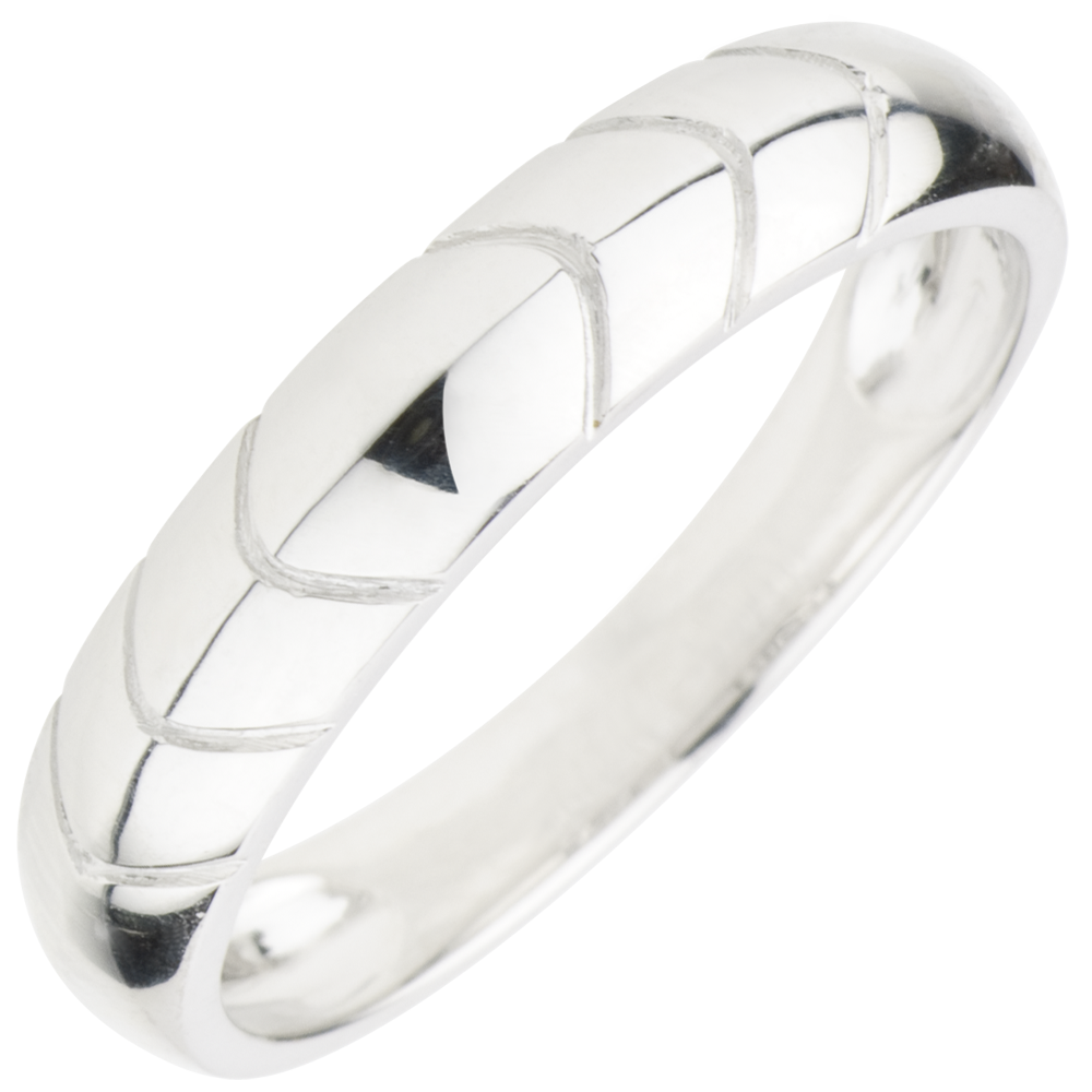 O verighetă bombată din aur alb cu un decor modern, puternic şi îndrăzneţ.