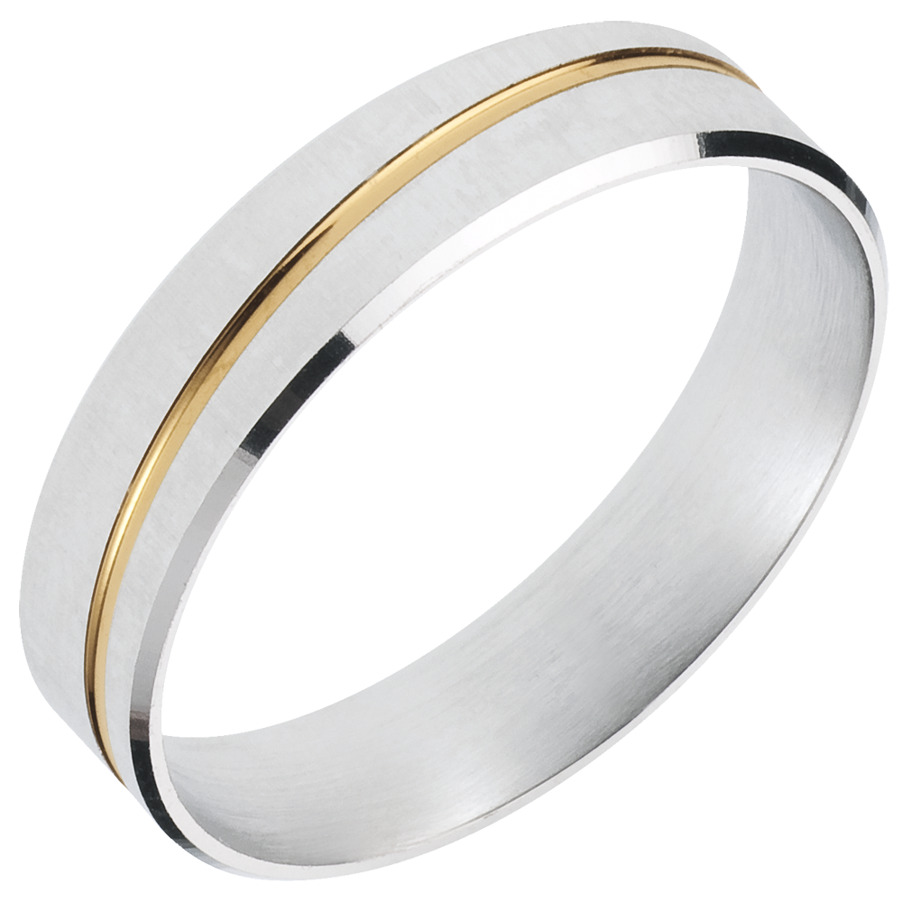 un inel din aur alb cu lustru periat este imprimat cu un fir de aur pentru o uniune senină
