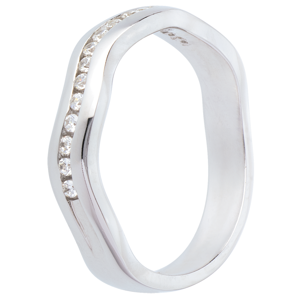 Un inel legănat de 16 diamante încrustate bară, devenind o verighetă încărcată de emoţie şi de aventură.