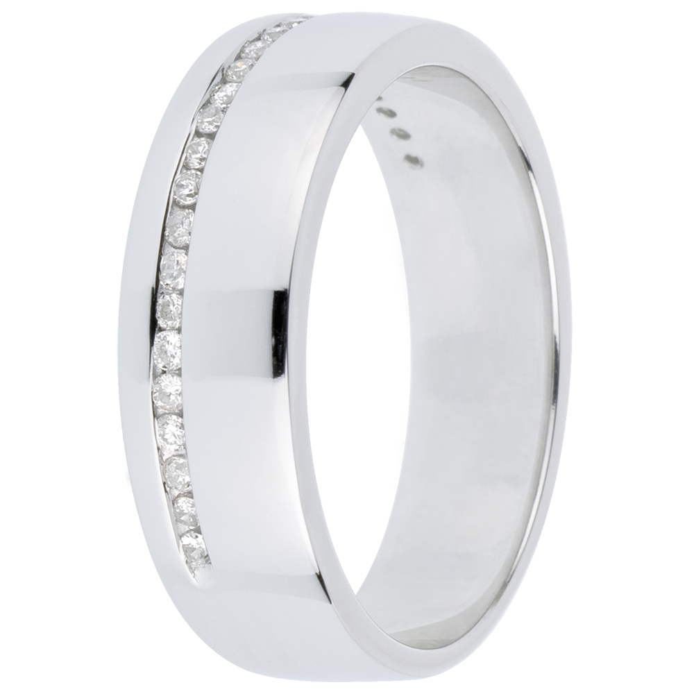 un inel lat din aur alb traversat de o linie de diamante tăiate briliant.