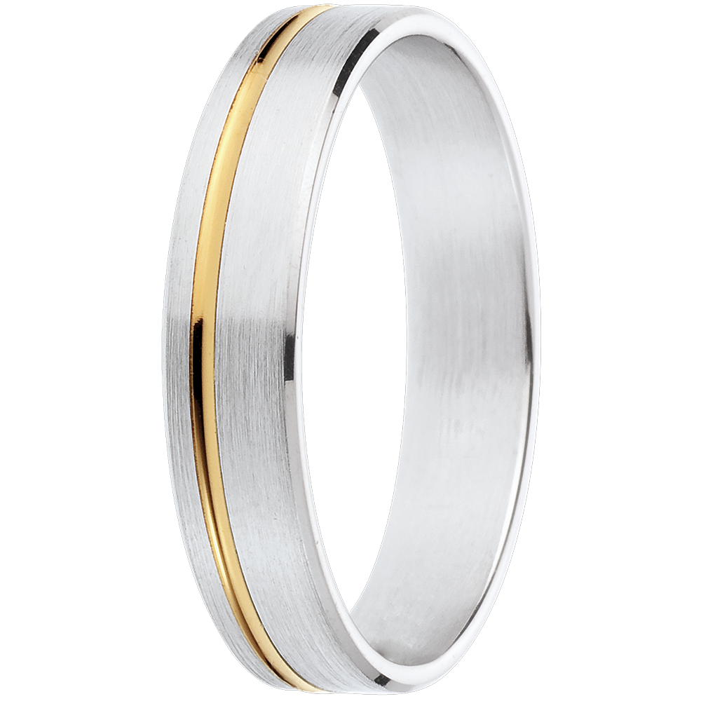 Un inel din aur alb impregnat de un fir de aur galben într-o uniune paşnică.