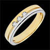 Această verighetă în două nuanţe de aur are un design aerisit mulţumită unei linii orizontale ce poartă în centru o trilogie de diamante.