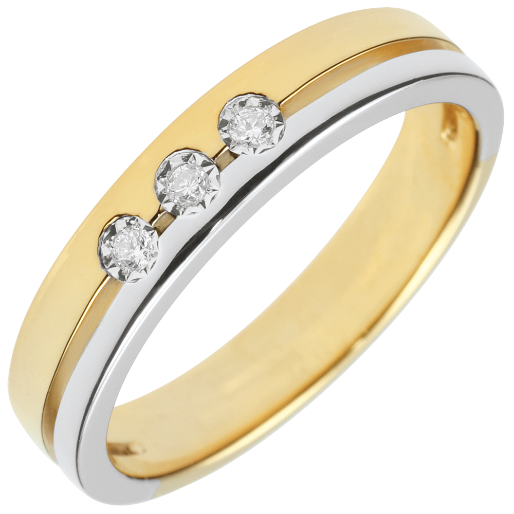 Această verighetă în două nuanţe de aur are un design aerisit mulţumită unei linii orizontale ce poartă în centru o trilogie de diamante.