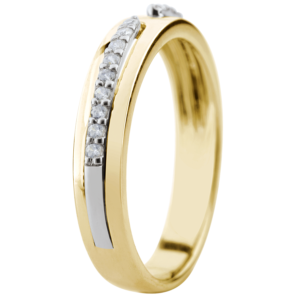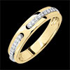 Două linii de diamante sunt unite ca într-o promisiune pentru eternitate într-un inel de aur galben.