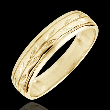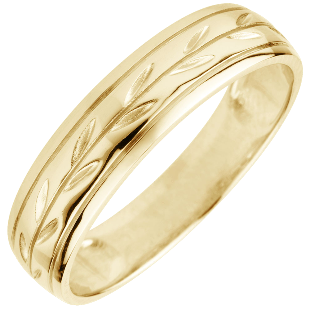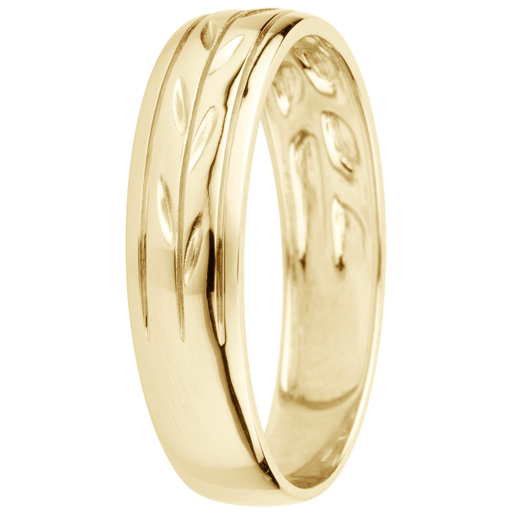 O verighetă lată din aur galben gravată de un frunziş etern.