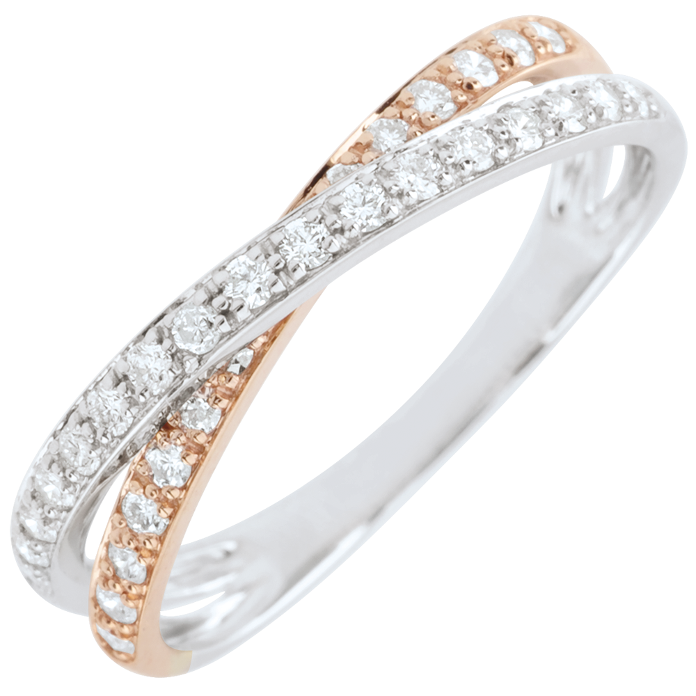 Două inele se unesc pentru a sigila cu graţie alianţa dintre cele două nuanţe de aur şi diamante.