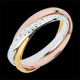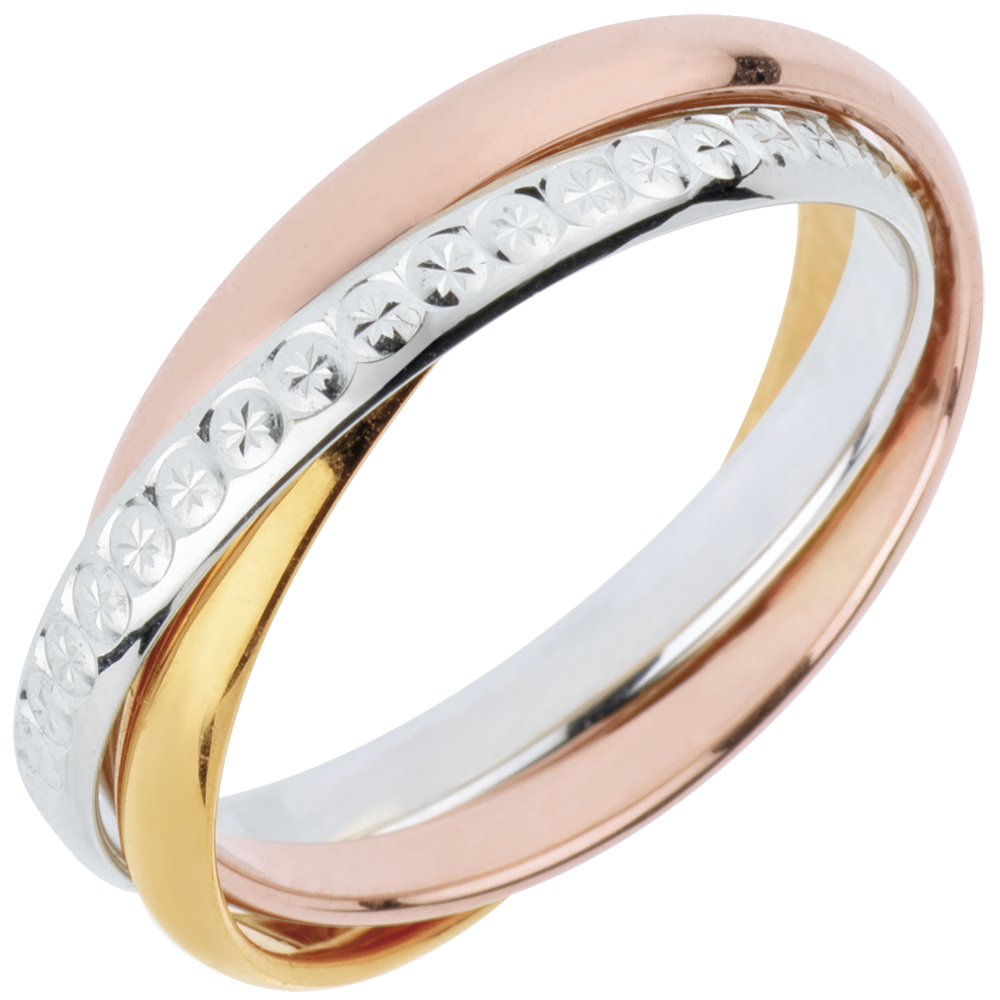 Un inel din aur galben, un inel de aur alb lucrat stil diamant şi unul din aur roz sunt unite.