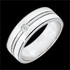 O verighetă lată din aur alb este împodobită cu un diamant central şi traversată de o bandă de aur cu aspect periat pentru un efect strălucitor şi totuşi mat.