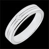 O verighetă lată din aur alb este împodobită cu un diamant central şi traversată de o bandă de aur cu aspect periat pentru un efect strălucitor şi totuşi mat.