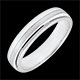 Un inel din aur alb este traversat de o bandă de aur cu aspect periat pentru un efect strălucitor şi totuşi mat.