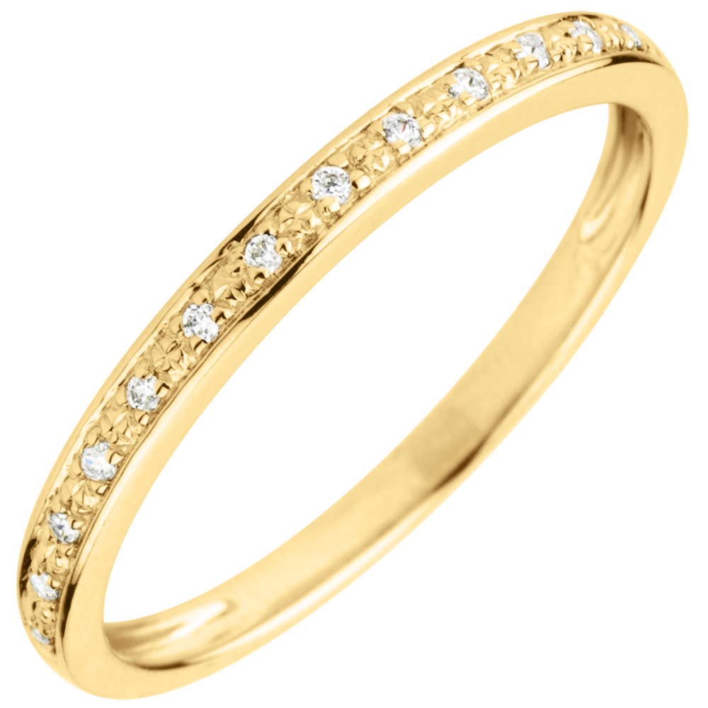O verighetă din aur alb cu diamante încrustate grăunte, elegantă şi atemporală. Această verighetă de căsătorie este ideală în însoţirea unui inel de logodnă sau la fel de bine, se poate purta singură.
