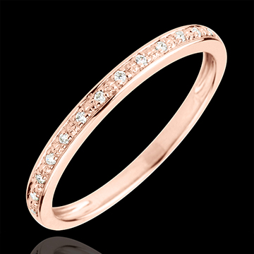 O verighetă din aur roz cu diamante încrustate grăunte, elegantă şi atemporală. Această verighetă de căsătorie este ideală în însoţirea unui inel de logodnă sau la fel de bine, se poate purta singură.