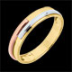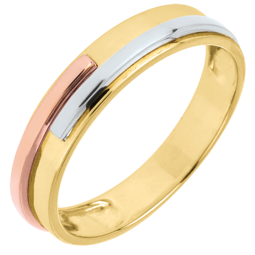 O bandă de aur galben înconjurată de o panglică de aur alb şi roz. O verighetă în trei nuanţe modernă şi unică.